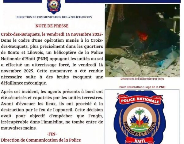 Alors que des rumeurs suggéraient que l’un des hélicoptères de la PNH avait été abattu par les bandits, un communiqué officiel de l’institution apporte des précisions. L’appareil, mobilisé en appui aérien aux unités au sol, a dû effectuer un atterrissage forcé en raison de bruits évoquant une défaillance mécanique, et non à la suite d’une attaque directe.